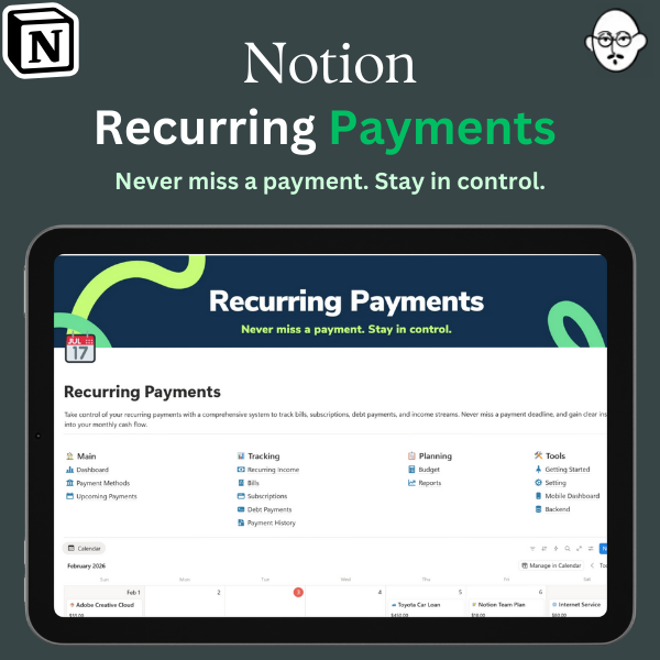 Recurring Payments - Notion Template for Bills, Subscriptions & Budget Tracking